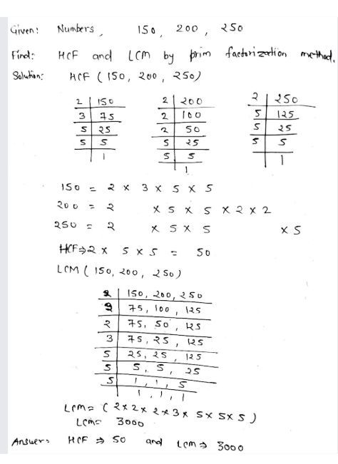 Find The Hcf And Lcm Of 150 200 250 By Prime Factorisation Method Snapsolve